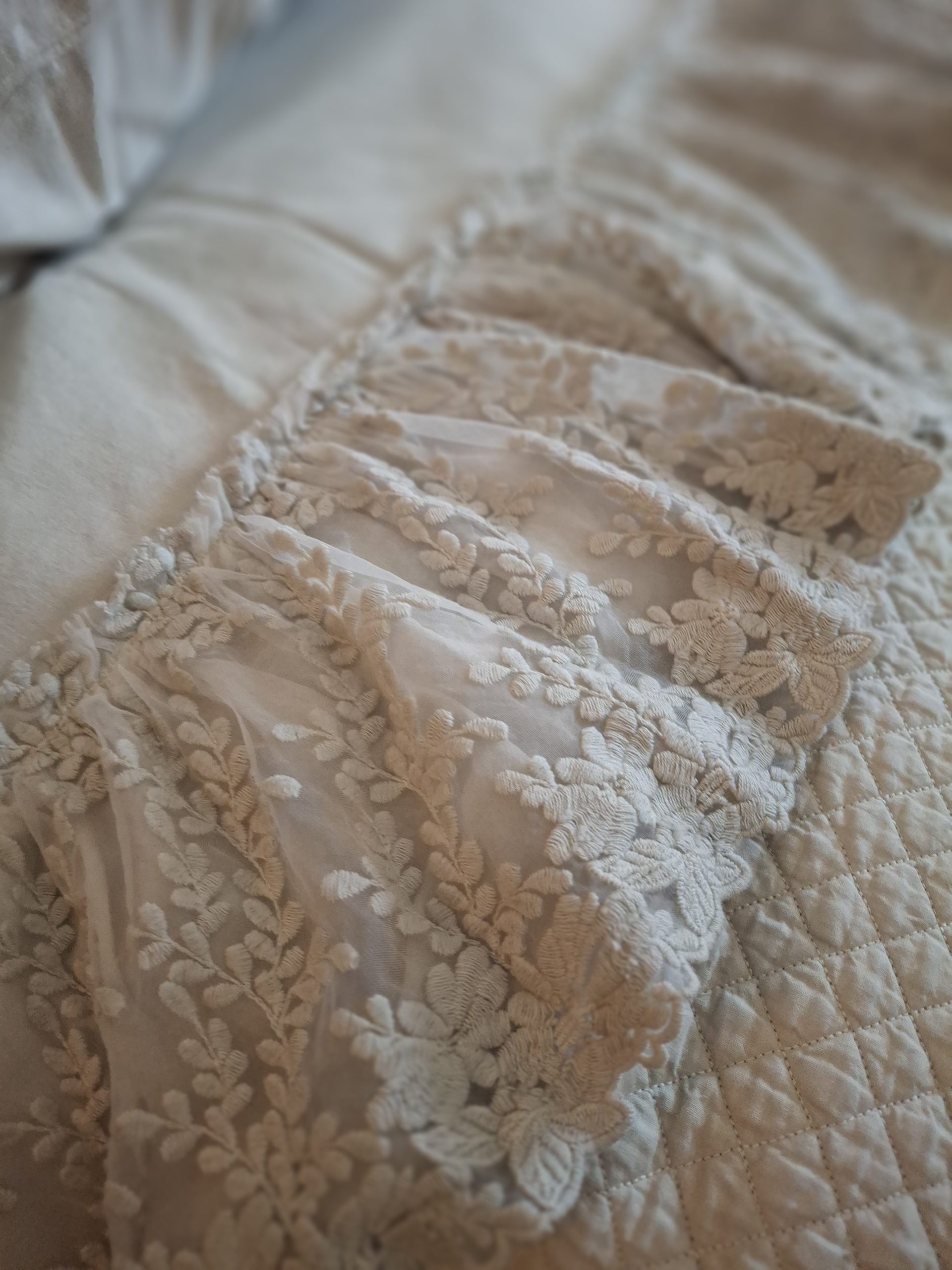 Completo lenzuolo realizzato sul nostro morbido cotone tinto in capo. Arrichito da una delicata e preziosa rouche di tulle ricamato e garza. La gala delle federe è solo su un lato. Disegnato e prodotto in ItaliaMatrimoniale: Sopra da lenzuolo 260x290cm + 2 federe 50×80 cm + sotto con angoli 180x200h30cm