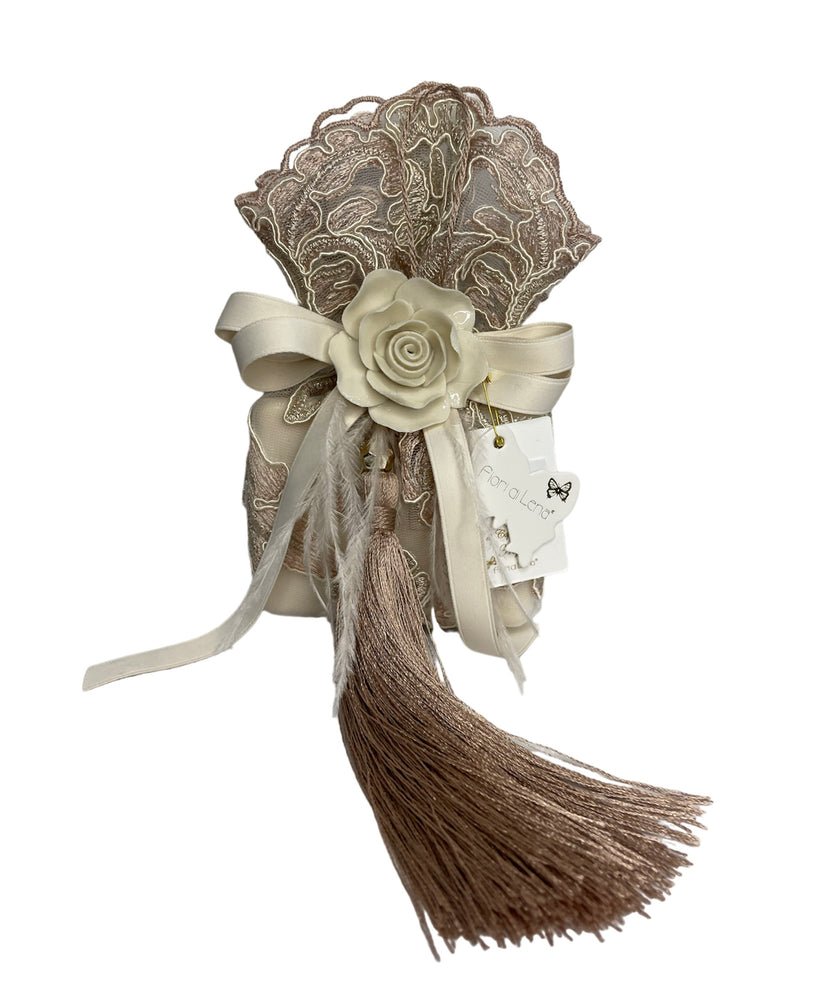 Sacchetto pizzo con sapone 200 gr nappa piume e rotellina capodimonte 1° misura con bustina